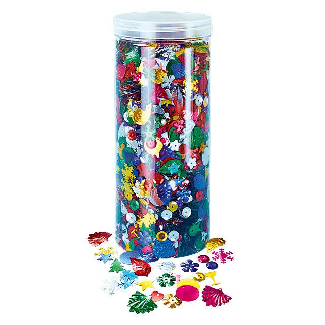Pailletten aus Acrylic Material für fantasievolle Kreationen und Dekorationen. Lieferung in praktischer Acryldose mit Schraubdeckel, damit immer Ordnung herrscht. Über 10’000 Pailletten in verschiedenen Farben und Formen, alle mit Loch zum Aufnähen, Aufziehen und Auffädeln. DIY Kinder Bastelspass für Halsketten, Armbänder usw.
