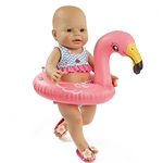 Badepuppen Schwimmset bestehend aus modernem Puppen Bikini mit farblich abgestimmter Rüschen Applikation und Flamingo Aufdruck, Puppen Strandschläppchen und aufblasbarer Flamingo Puppen Schwimmring. Damit die Baby Puppe Baby Love auch sicher wieder an Land kommt.