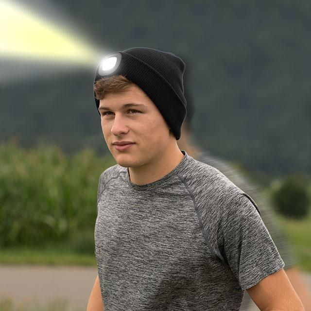 Lichtstarke innovative LED Strickmütze hält die Ohren warm und 4 LEDs verschaffen den Durchblick beim Joggen und Spazieren bei Nacht. Ganz einfach mit der Hand über die LEDs wischen oder per Knopfdruck und das Licht geht an. Mütze waschbar – LEDs sind entnehmbar. Mit integriertem USB Ladestecker. Alles im Doppelpack, damit das Licht nicht ausgeht. Material: 100% Polyacryl.