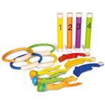 Der Wettkampf-Klassiker bestehend aus 4 Schwimmstäben, 4 Schwimmringen, 3 Delfine und 3 Wassertierchen (halten sich aufrecht am Schwimmbadboden). Trainiert die Unterwassergeschicklichkeit und garantiert Riesenspass für heisse Sommertage. Länge Delfine ca. 15,5 cm.