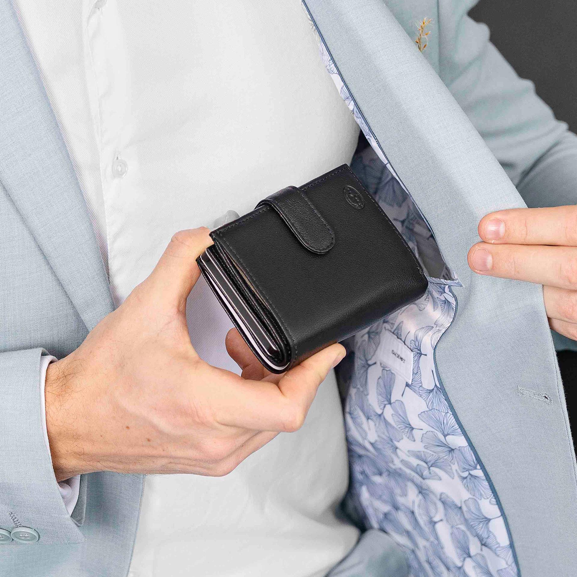 Bietet viel Platz für Karten und Noten und ist dennoch kompakt in der Grösse von Angelo Fortuna. Aus 100% echtem Leder. In den Kartenhalter passen 7 Kreditkarten, welche durch das Aluminium Gehäuse vor Datendiebstahl geschützt sind und durch den Schieber einfach entnommen werden können. 2 Notenfächer, 7 zusätzliche Kartenfächer, 2 Sichtfächer und eine Lederlasche mit Knopfverschluss. Grösse geschlossen: 10,5 x 7,5 x 2,5 cm, Grösse offen: 16 x 7,5 cm.