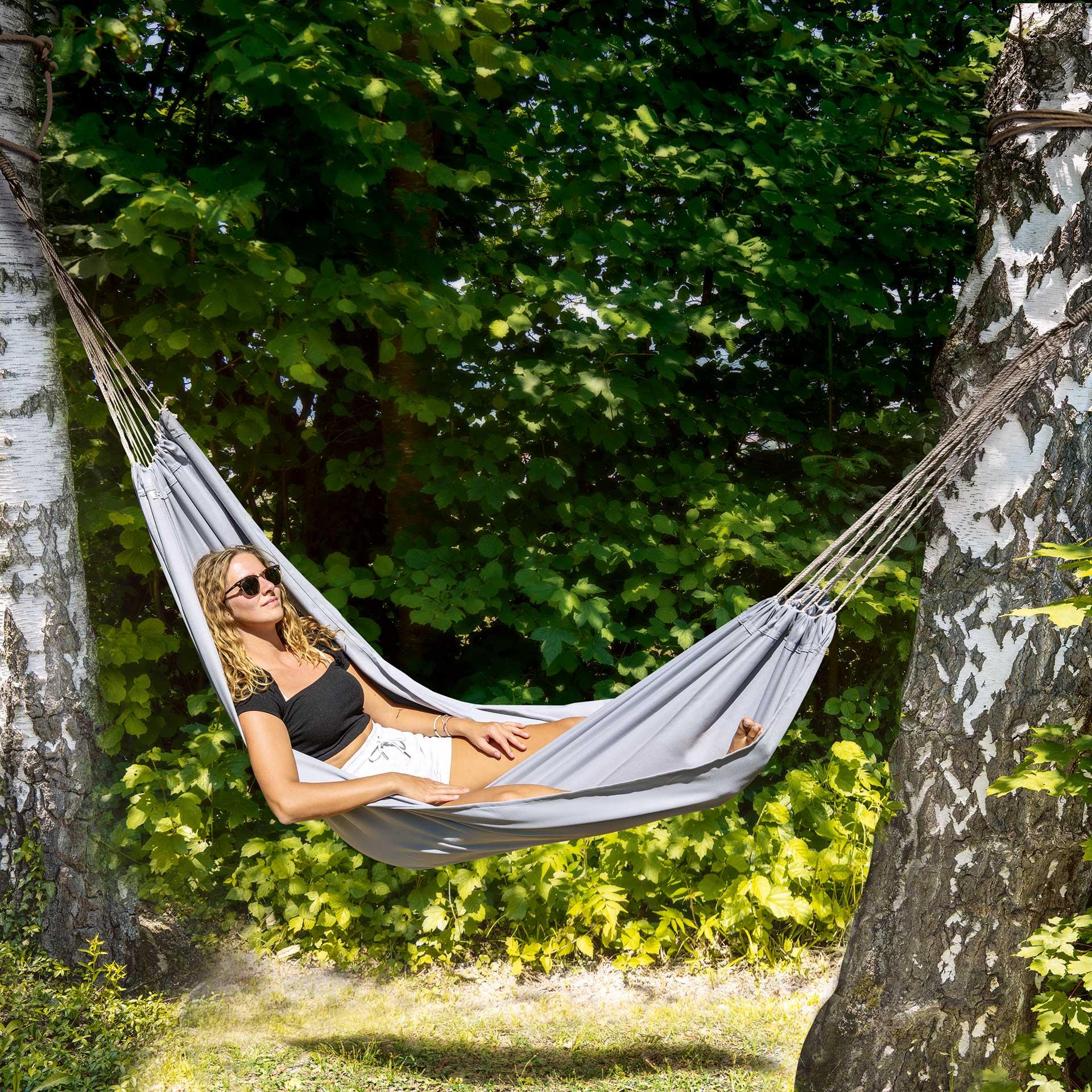 Der Klassiker unter den Hängematten, der auf kleinstem Raum zusammenfaltbar ist, in trendig grauer Farbgebung. Jetzt in der komfortablen Grösse 210 x 130 cm, damit Sie sich rundum wohlfühlen und entspannen können. Aus sehr starkem, witterungsbeständigem 100 % Polyestermaterial mit strapazierfähigen Polyesterschnüren. Sommerwetterbeständig. Belastbarkeit: 140 kg