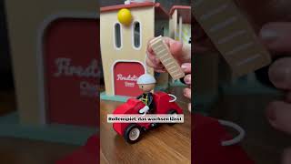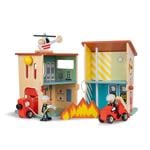 Rette, was zu retten ist – Einsatz frei für deine Feuerwehr! Das Feuerwehrstation Holzspielset bringt Action in dein Kinderzimmer: Du kannst das Spielhaus aufklappen und zwei Gebäude bespielen – oder es zu einem hohen Feuerwehrturm zusammenbauen. Mit Helikopterlandeplatz, aufklappbaren Türen und viel Zubehör wie Fahrzeugen, Figuren, Flammen und Werkzeugen wird dein Rollenspiel richtig spannend. Die liebevoll gestaltete Feuerwache ist aus Holz gefertigt und bietet alles für deine Rettungseinsätze. Du entscheidest, wie dein Einsatz abläuft: Löschfahrzeug raus, Helikopter starten, Leitern anlegen und das Feuer bekämpfen – alles ist möglich! Die flexible Bauweise erlaubt immer neue Szenen und Abenteuer. Feuerwehrstation Holzspielset, Grösse geschlossen 26 x 17 x 23,5 cm, mit Helikopter, 2 Fahrzeugen, Figuren, Zubehör, insgesamt 26 Teile. Ab 3 Jahren.