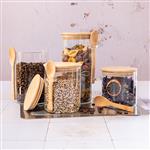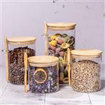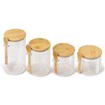 Zeitloses Design trifft funktionale Vorratshaltung: Das Vorratsgläser Set mit Bambusdeckel vereint praktische Aufbewahrung mit ästhetischem Anspruch. Vier unterschiedlich grosse Glasbehälter mit passendem Bambusdeckel und Löffel bieten eine hygienische Lösung zur Lagerung von Lebensmitteln wie Müesli, Hülsenfrüchte, Nüsse, Kräuter, Reis, Zucker und viele mehr. Die klaren Glaswände ermöglichen jederzeit eine schnelle Sichtkontrolle des Inhalts, während der luftdichte Verschluss die Frische bewahrt. Die passenden Löffel sind platzsparend am Glas befestigt – ideal für den täglichen Einsatz in Küche oder Speisekammer. Ein durchdachtes Aufbewahrungssystem für strukturierte Vorratshaltung mit Stil. Stapelbare Vorratsgläser in 4 Grössen: Ø 10 x 10 cm (650 ml), Ø 10 x 12 cm (750 ml), Ø 10 x 15 cm (1000 ml), Ø 10 x 20 cm (1400 ml).