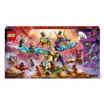 Der LEGO NINJAGO Lichtbogendrache lässt Jungen und Mädchen ab 9 Jahren legendäre Actionszenen aus der 3. Staffel der TV-Serie NINJAGO Aufstieg der Drachen nachstellen. Das Bauspielzeug beinhaltet einen 2-köpfigen Drachen, der Schwanz, Kopf, Hals, Kiefer, Beine, Füsse und Klauen bewegen kann. Kinder können den Shooter in seiner Brust aktivieren und seine grossen Folienflügel mithilfe des Hebels am Rücken vor und zurück schwenken. Dieses actionreiche Spielset beinhaltet 8 NINJAGO Minifiguren, um Ninja-Fans spannende Abenteuer darstellen zu lassen. Die Ninja-Helden Lloyd, Cole, Wyldfyre und Kai sowie ihr Verbündeter Pixal sind bestens ausgerüstet, um es mit den Bösewichten Drix und Zarkt und einem Drachenkämpfer aufzunehmen, die ebenfalls für jedes Duell gerüstet sind. Für noch grösseren Spielspass beinhaltet das LEGO Set mit Spielzeugdrachen auch einen coolen Spinjitzu-Spinner. Kinder können eine Figur in diesen Kreisel setzen und einen Knopf an dem dazugehörigen Startkatapult drücken, um ihn loswirbeln zu lassen. Wenn er auf sein Ziel trifft, können 2 Energie-Elemente abplatzen.