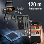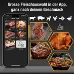 Nie mehr trockenes Steak, dafür jede Menge Grillspass! Das Wireless Fleisch Thermometer mit 2 Sonden lässt dich per Bluetooth und App entspannt die Kerntemperatur tracken, egal ob Steak, Hähnchen oder Burger. Die superscharfen Sonden messen präzise bis ins Fleischinnere, der Timer piept rechtzeitig und Alarme warnen vor Übergaren, perfekt für epische BBQ-Partys oder gemütliche Ofenbraten. Wasserdicht, hitzebeständig bis 300°C, super einfach zu reinigen. Wireless Fleisch Thermometer mit 2 Sonden, Gerät mit Display für Temperatur (Akkubetrieb 2000 mAh), Grösse 13 x 15 x 2,5 cm. Kabellose Sonden aus Edelstahl je 12,5 cm lang. Lieferung inkl. USB-Ladekabel.