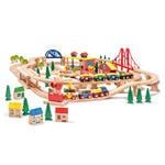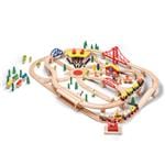 Rails en hêtre massif. Deux rames avec couplages magnétiques, de nombreux détails raffinés et des accessoires d'animation, dont une grue élévatrice de conteneurs, etc. Livraison comme illustré, dans un sac en nylon. Dimensions du sac: env. 45 x 35 x 13 cm.