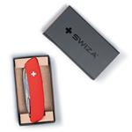 Le seul couteau pliant avec sécurité – voilà un compagnon fidèle pour sculpter, scier et partir à l'aventure. La pointe de la lame est arrondie et équipée d'un bouton-poussoir de sécurité. Le couteau de poche Swiza du Jura présente une surface antidérapante pour une prise en main facile, avec ouvre-boîte, tournevis, poinçon et alésoir, anneau pour clés et pince à épiler. Attention: il ne s'agit pas d'un jouet. Utilise le couteau uniquement sous la surveillance d'une personne adulte. Longueur 16,7 cm, poids 110 g, 8 fonctions.