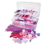 Set per lavoretti, con 350 pezzi: scovolini lucenti e multicolor, bastoncini di legno colorato, ponpons, spago trasparente, cordino brillante, occhietti in rilievo con ciglia, moosgummi e parti scintillanti. Per creazioni di fantasia come animali, figure, monili e molto altro. Il tutto ben disposto nell’apposito box di plastica (ca. 31 x 15 x 17 cm).