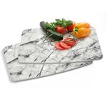 Set di 2 pratici taglieri dall'aspetto trendy marmorizzato, pensati per preparare i cibi ma anche per servirli. In materiale plastico salvalama, quindi anche facili da pulire e con lato inferiore antiscivolo. Dimensioni: 40 x 29 x 0,8 cm.
