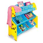 Lo scaffale contenitore (82 x 82 x 33 cm) col motivo grazioso della giraffa, che permette anche ai piccoli di fare ordine facilmente. Due grandi ripiani per libri, 2 box grandi (39 x 29 x 12,5) e 4 box piccoli (29 x 19 x 12,5 cm), per giocattoli, accessori e così via. Lastre di MDF colorate, box di plastica.