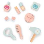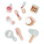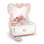 Tavolino da trucco in legno, con specchio, cassetto e molti accessori in legno come cipria, ombretto, rossetto, lucidalabbra, profumo, asciugacapelli, spazzola e nastri per capelli. Dimensioni: 30 x 35 x 23 cm. In legno, con alimentazione a batteria. Dai 3 anni.