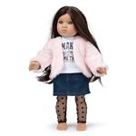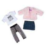 Outfit alla moda per bambola, composto di giacca morbida in ecopelliccia rosa, maglietta bianca stampata, minigonna di jeans blu e leggings retati a pois. Dai 3 anni.